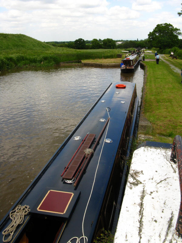 One boat emerges from a lock as Lucy approaches from the lower lock
