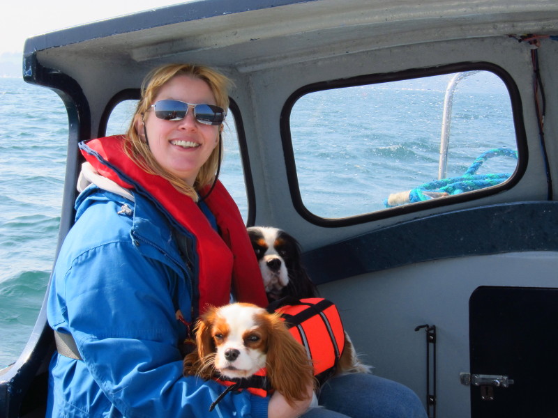 Lucy with Hetty, looking a little uncertain with her life-jacket on.