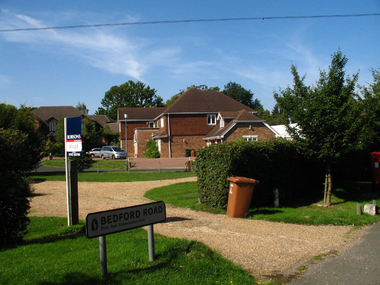 suburban roads have no pavements. The roadsigns have "Moor Park Conservation