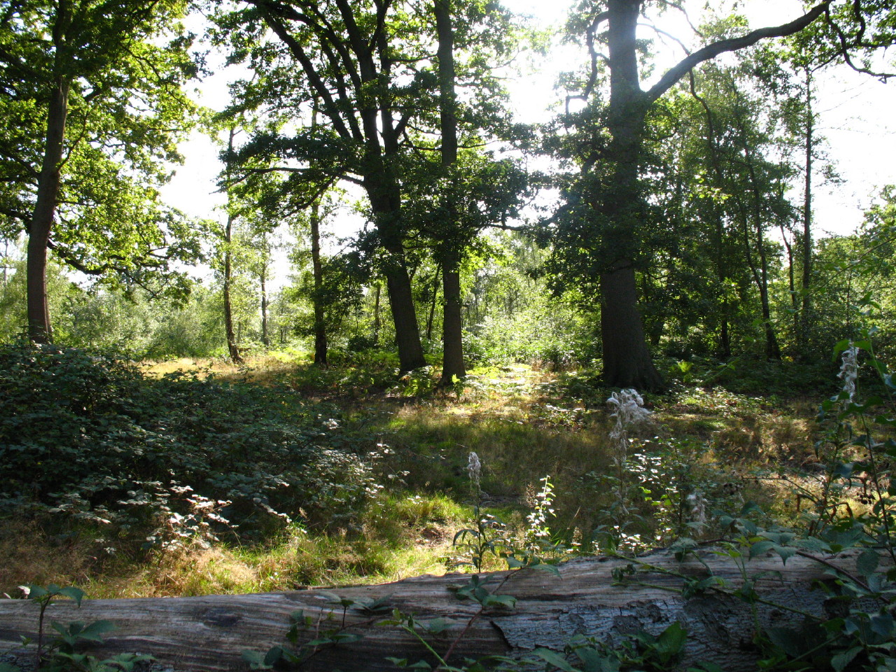A pleasant sunny glade in Oxhey Wood. The instruction "where the track bends